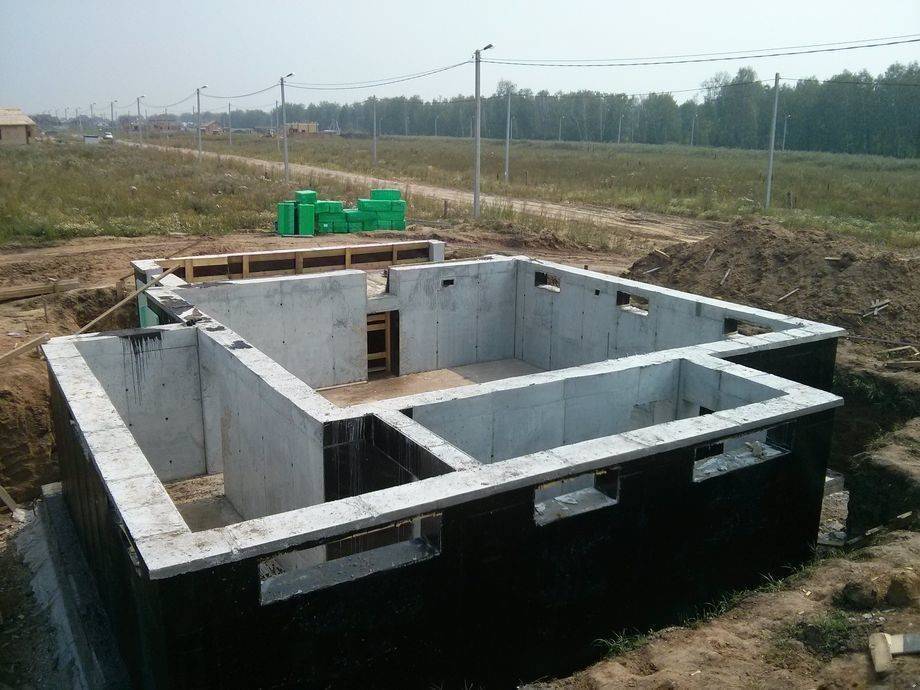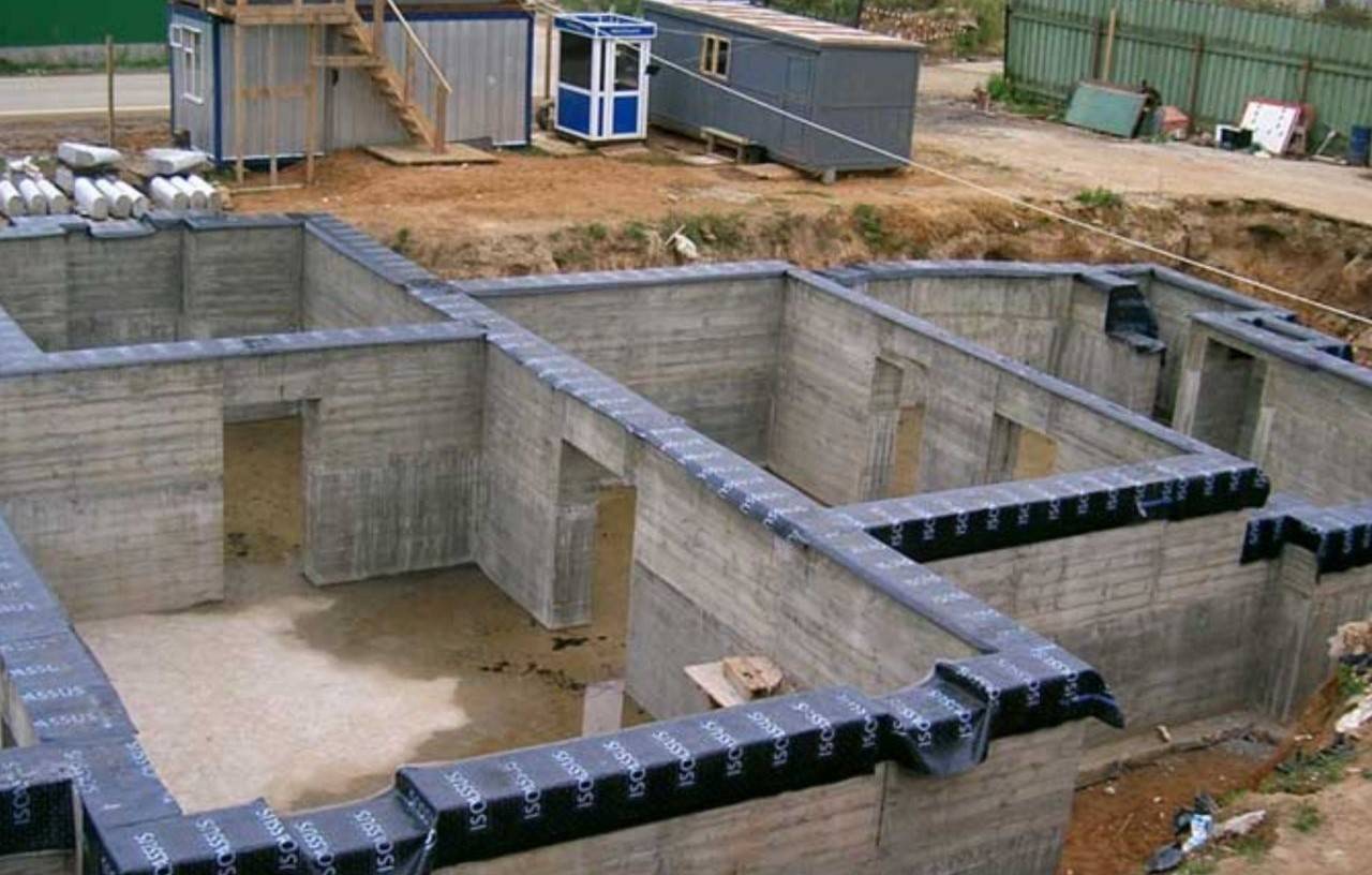 На подготовленное основание монтируют сборные элементы, выполняют кладку из кирпича или блоков, или устраивают монолитный фундамент для дома с подвалом. Поверхности конструкций изолируют от попадания влаги. Используют любой из экономически целесообразных в конкретных условиях способов для создания защитного барьера: