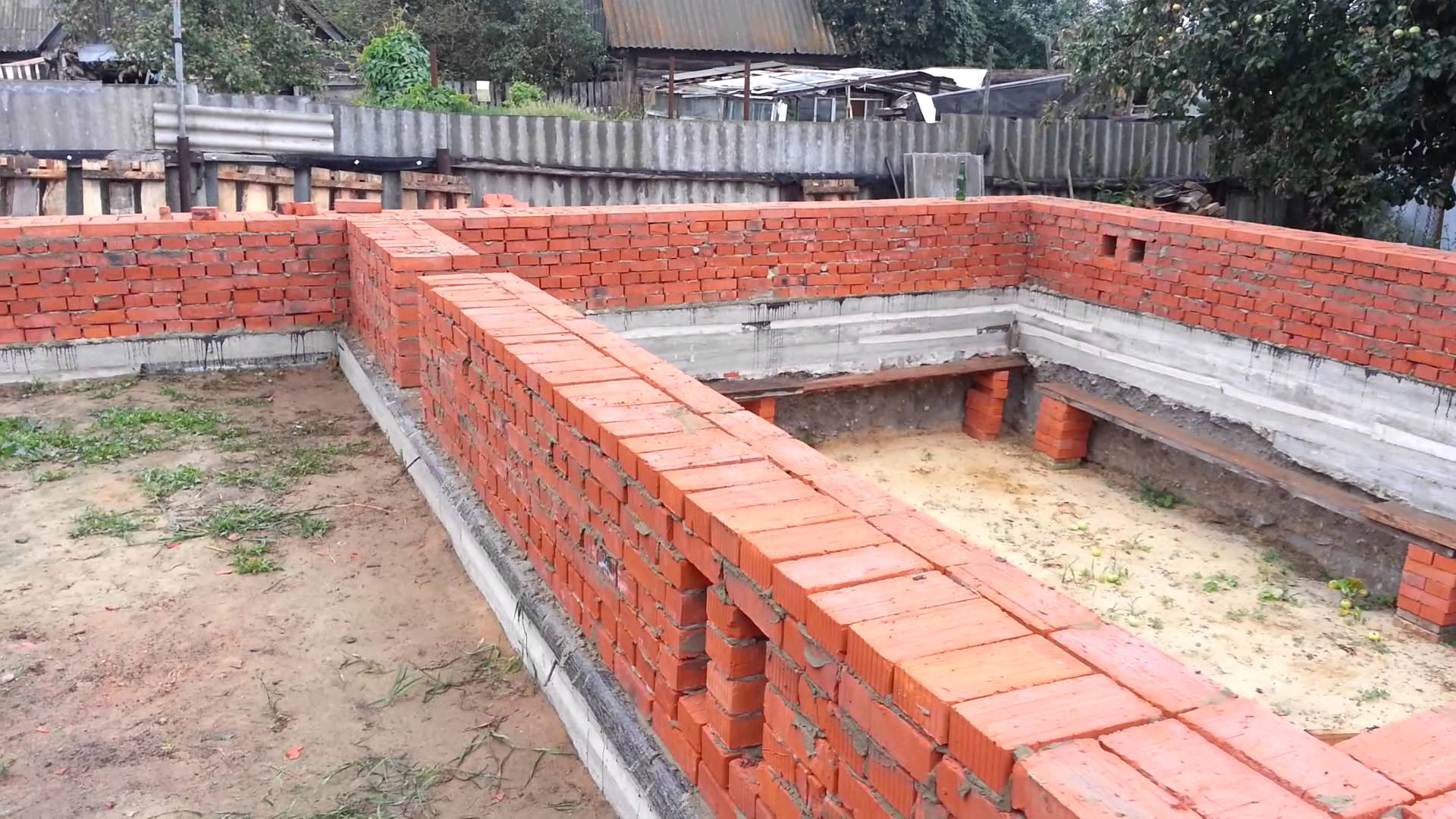 Для сооружения фундаментов используют специальный кирпич, не пропускающий влагу. При возведении стен, с шагом 0.4 м необходимо сделать ленточный пояс из бетона с армированием, который усилит конструкцию. Верхняя часть такого основания также сооружается из бетона.