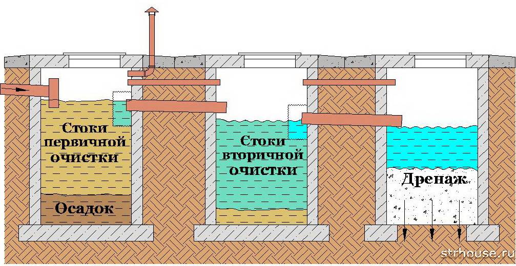 Этот вид септика представляет собой промежуточный вариант между накопительной ямой и полноценной системой очистки. Включает в себя несколько герметичных емкостей, в которых вода отстаивается и выводится наружу уже в очищенном виде. Переливной септик может быть двухкамерным или трехкамерным. Процесс очистки производится в несколько этапов.