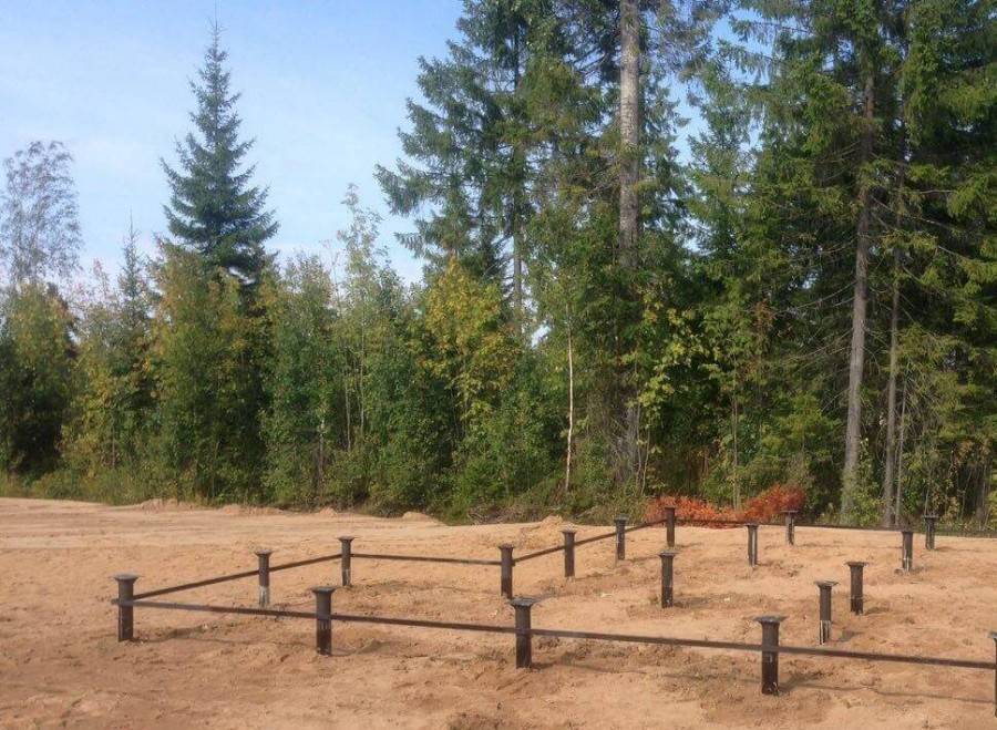 Монтаж обвязки, ростверка. Ростверк бывает ленточной и плиточной. Ленточный состоит из металлических (швеллер), железобетонных или древесных балок, расположенных по периметру, а также под несущими стенами. Плиточный используется, когда сваи расположены равномерно по всей площади будущего дома.