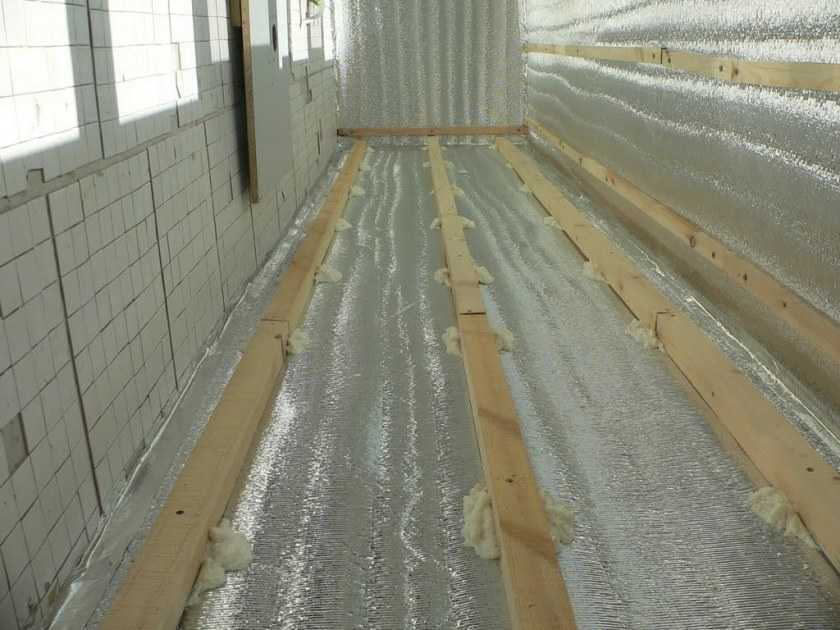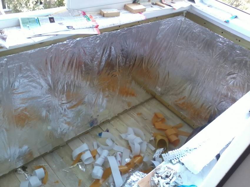 В первую очередь необходимо позаботиться об отсутствии сырости. Для этого на пол балкона укладывается гидроизоляционный слой. Материалом для него обычно служит пенофол или полиэтилен. Иногда используется мастика на основе битума. Но в этом случае придётся ждать не менее суток, пока она высохнет.