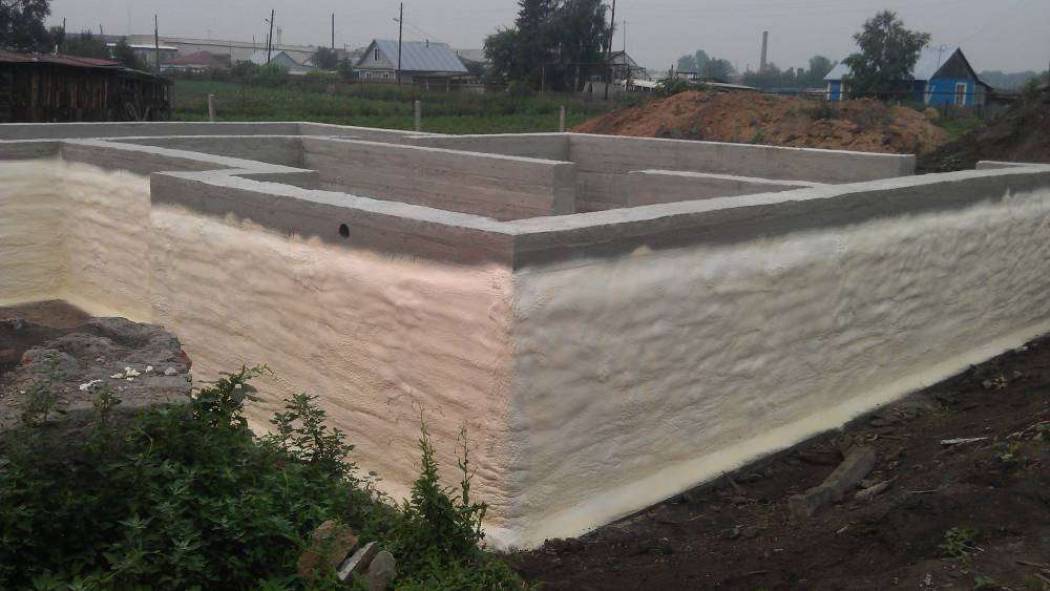 Утепление фундамента дома снаружи выполняют и при помощи жидкого утеплителя, который напыляется на основание при помощи специального оборудования и быстро застывает. Пенополиуретан способен хорошо защитить бетон от негативного воздействия, поскольку кроме, стандартных характеристик имеет ряд преимуществ: