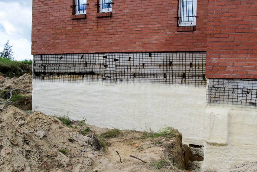 Для этого фундамент откапывают по всему периметру, очищают от земли. После этого в основании устраняют все трещины и устанавливают гидроизоляцию. Защита от влаги может быть выполнена обмазочным способом, например, битумной мастикой или с помощью оклейки гидроизоляционными материалами (как вариант, рубероидом). В траншею насыпают утеплитель и заливают бетонную стяжку.