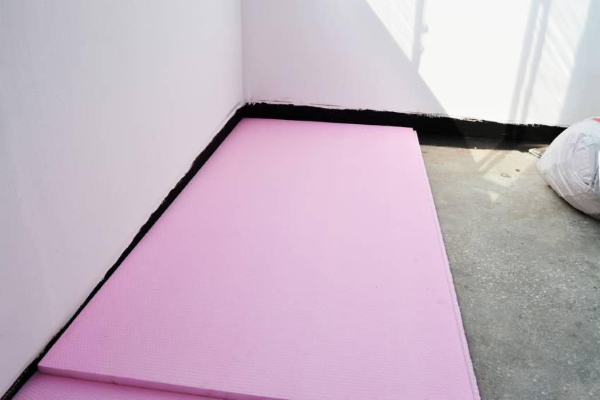 - На гидроизоляцию укладывается утеплитель. Специалисты рекомендуют использовать специальную продукцию – перфорированный пеноплекс, который имеет специальные пазы для укладки электрического кабеля или трубок водяного контура.