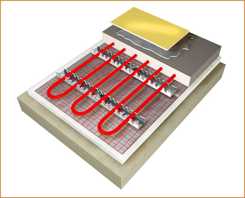 При первом варианте производится заливка водяного контура 5-сантиметровым слоем стяжки. Необходимо учитывать, что стяжка создает дополнительную нагрузку на фундамент и весь каркас строения в целом (ее вес в среднем составляет около 500 килограмм на квадратный метр), в связи с чем до старта работ целесообразно проверить, выдержит ли дом требуемую нагрузку.