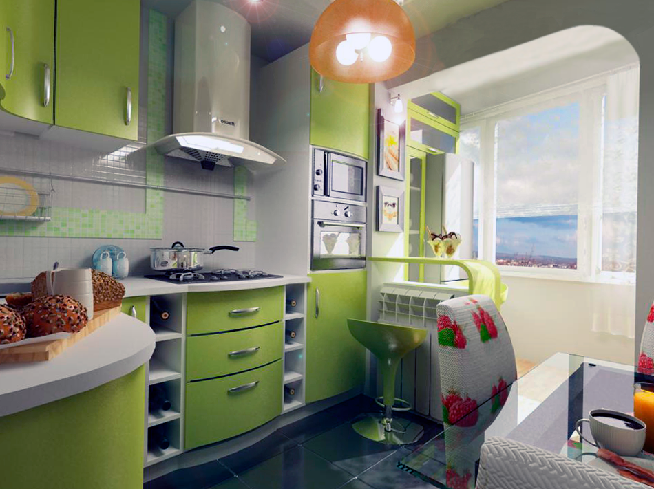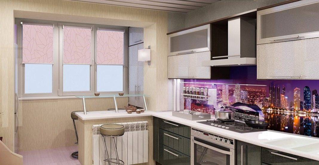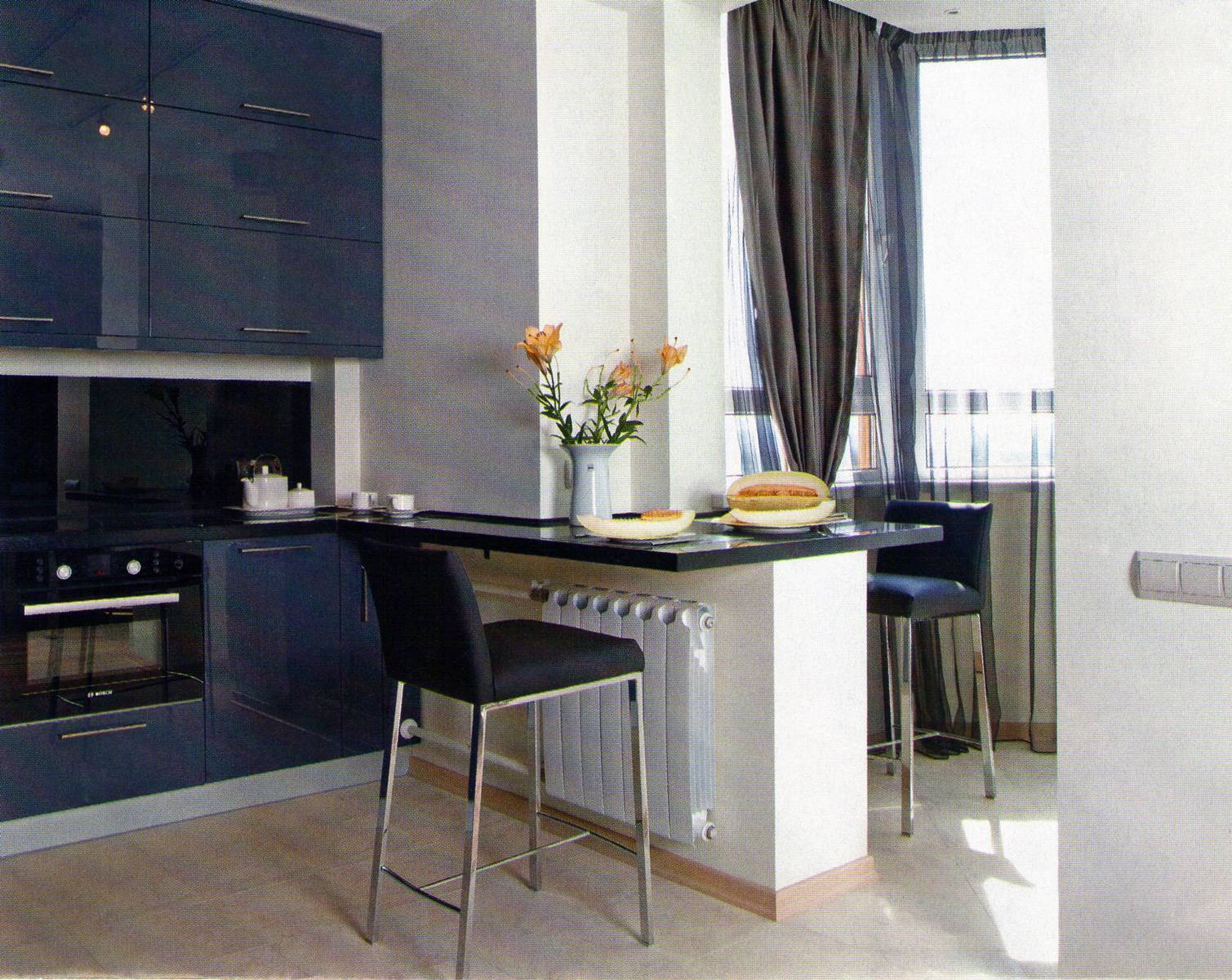 Дизайн кухни. Для того чтоб нормально существовать в расширенной за счет балкона кухне нужно позаботиться об его утеплении – это обязательно двухкамерные окна ПВХ, теплый пол, утепленный потолок и стены. Иногда бывает так, что каменный простенок под оконной рамой убирать не разрешают и выносить отопление на балкон так же, тогда этот монолитный простенок можно приспособить под барную стойку, а стулья вынести на сторону балкона, это существенно сэкономит пространство на кухне.