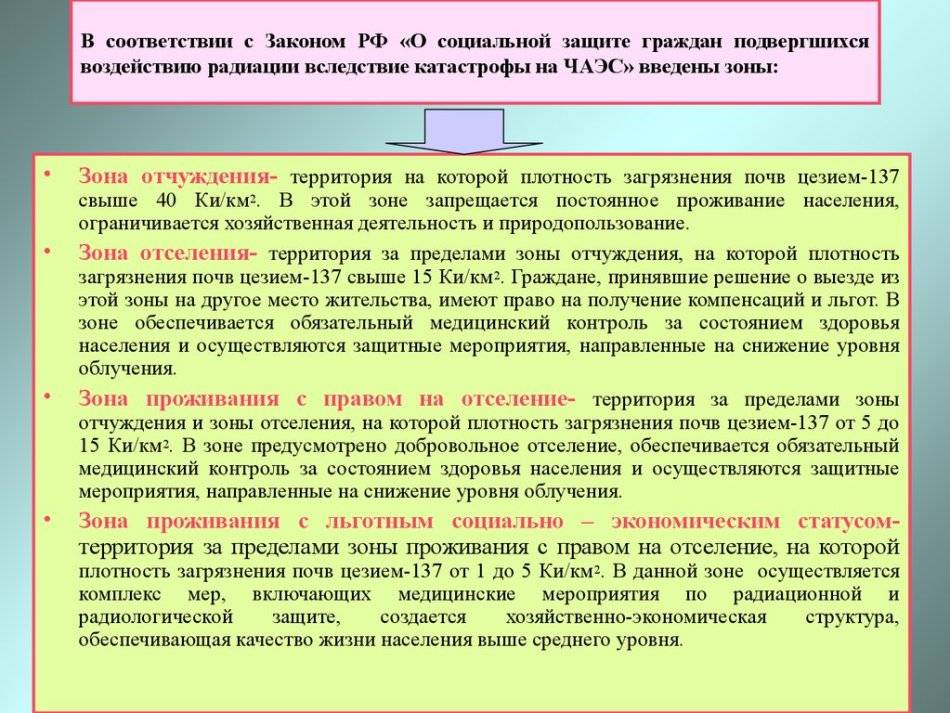 Кроме того, если плотность загрязнения почвы составит больше 40 кюри/кв. км, а также доза облучения в течение года может превышать 5,0 мЗв, то население будет отселено. На остальной территории зоны гражданам, принявшим решение о выезде, предоставляются компенсации и льготы.