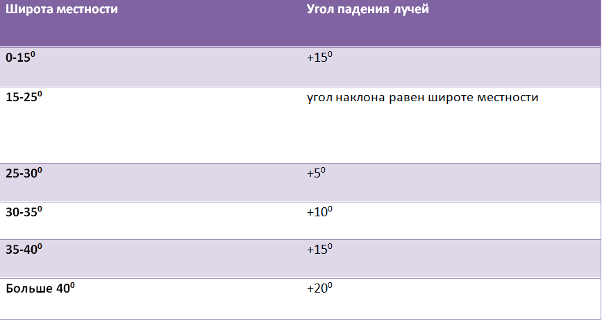 Чтобы более точно определить коэффициент солнечной инсоляции, нужно учесть значение географической широты. Поскольку, как уже было сказано, из-за отклонения земной оси от линии перпендикуляра угол падения света неодинаков на всех участках, следует добавить к показателю широты размер допустимой погрешности.