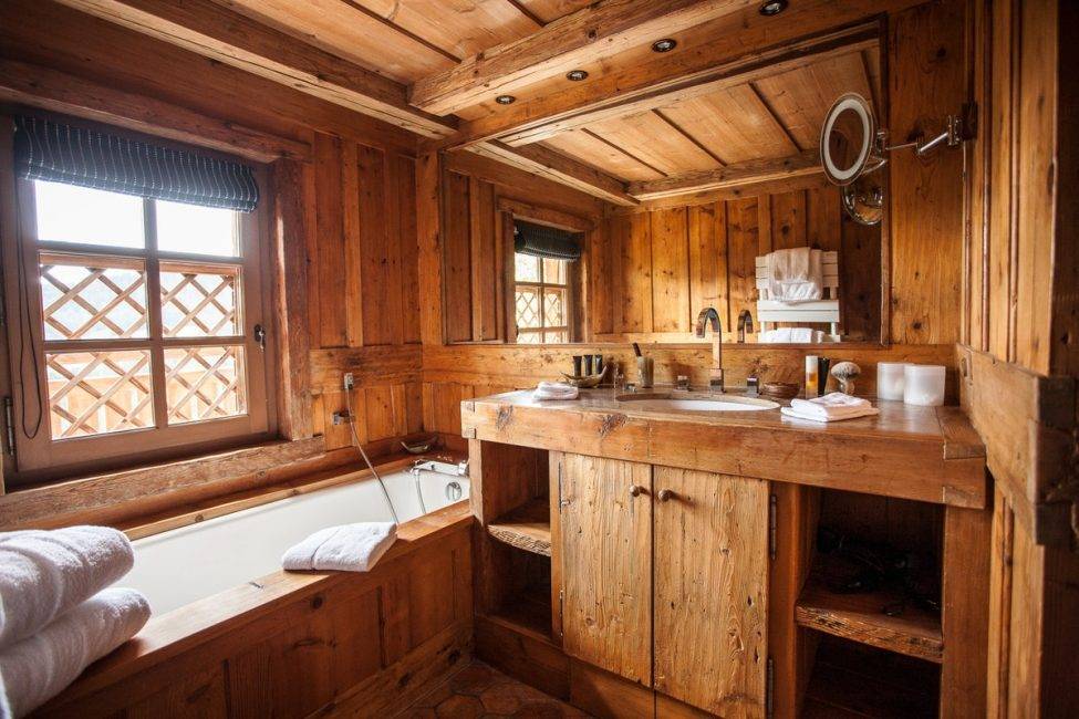 Для тех, кто хочет сохранить в интерьере комнаты элементы деревянной отделки, более приемлем второй вариант, когда понизу создается влагостойкий барьер с помощью облицовки стены кафелем, верх же стены отделывается деревянными материалами. Высота защитной панели, облицованной кафелем, обычно делается в пределах 1,5–1,7 м, выше которой стена обшивается деревянной вагонкой или оставляется без дополнительной отделки, если внутренняя поверхность стены удовлетворяет эстетическим требованиям. Чтобы снизить восприимчивость древесины к водяному пару (прямое попадание воды на верх стены ванной комнаты происходит редко), поверхность обрабатывается защитными пропитками и вскрывается несколькими слоями лака, который дополнительно защищает деревянные детали отделки от воздействия влаги.