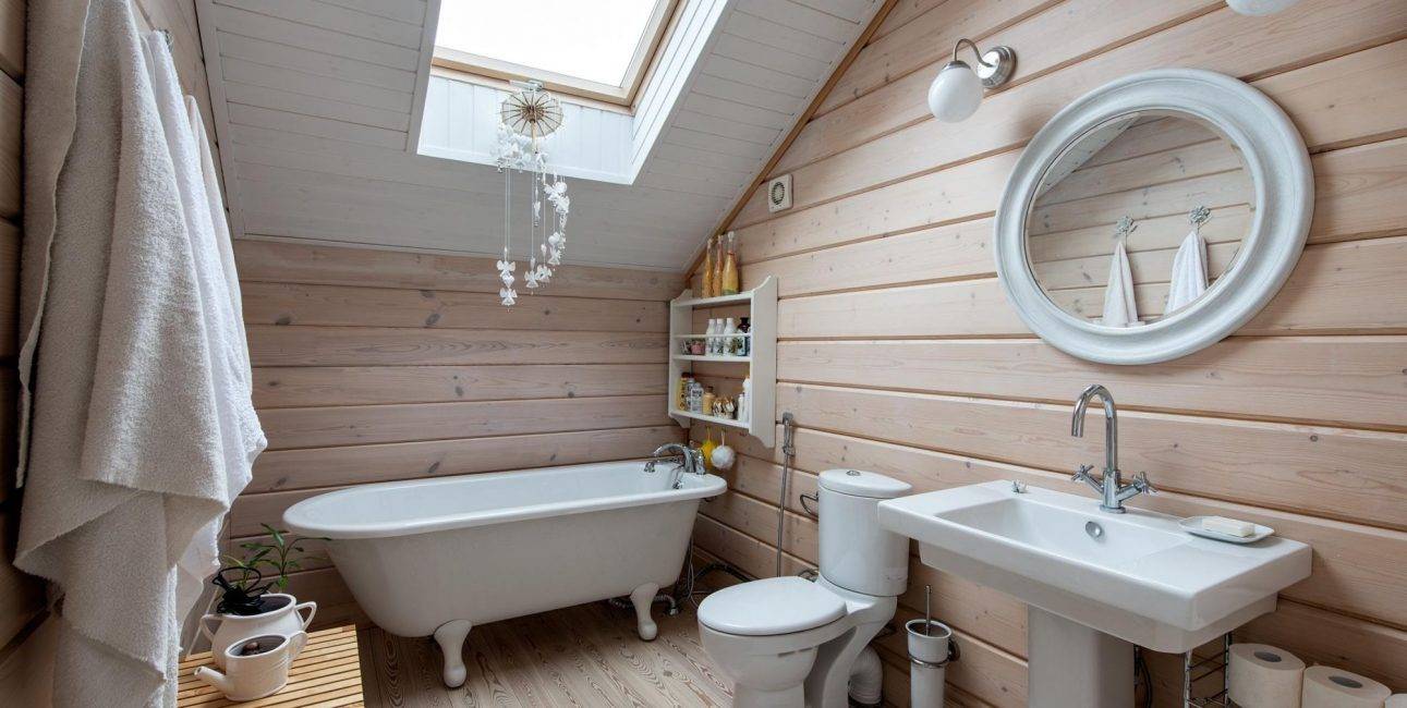 Выбирая материал для этого вида работ, необходимо помнить о том, что отделка ванной в доме из бревна под действием скачков температуры и влаги будет обязательно усаживаться и рассыхаться. Для предотвращения таких изменений, выбираются технологии, которые предполагают использование обрешетки и сооружение фальшь стены. Подобные элементы возводятся из гипсокартона и оцинкованного профиля. Зазор между основой и финишной отделкой будет работать как часть вентиляции.