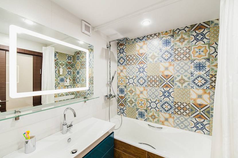 Плиткой с геометрическими фигурами или узорами можно оформить стену возле ванны.