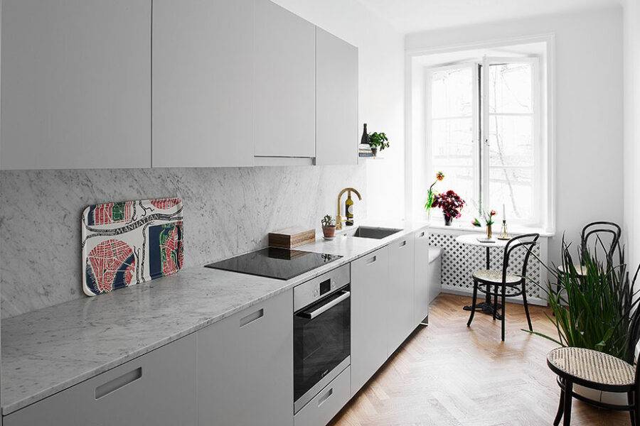 Если вы хотите по-настоящему роскошную кухню, выбирайте дизайн в скандинавском стиле. Он позволяет облагородить холодную белизну основного кухонного гарнитура. Сочетание с камнем, деревом, другими простыми природными материалами однозначно выглядит потрясающе. Помещение станет максимально гармоничным с небольшим количеством аксессуаров в 1-2 тонах и с парой горшков декоративной невысокой зелени (исландский мох, суккуленты, мята и т. д.) Акценты поможет расставить грамотная точечная подсветка.