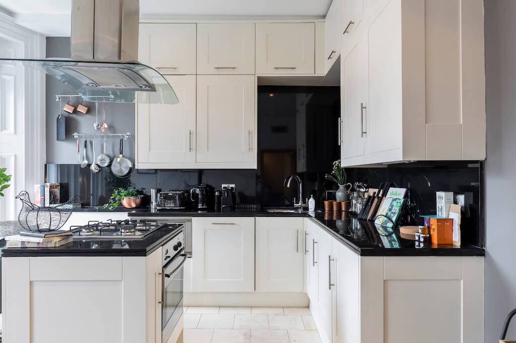 Черные ручки и аксессуары, картины в черных рамках с паспарту, контрастная затирка на швах плитки позволяют подчеркнуть черную вытяжку