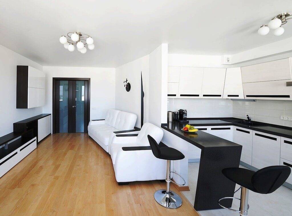 Черно-белая кухня, совмещенная с гостиной