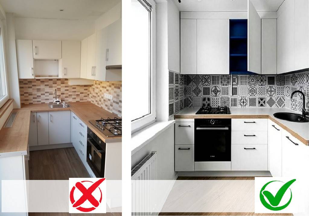 Почти одинаковые по площади кухни визуально воспринимаются по-разному. Во втором случае благодаря верхним шкафам под потолок удалось освободить место у окна