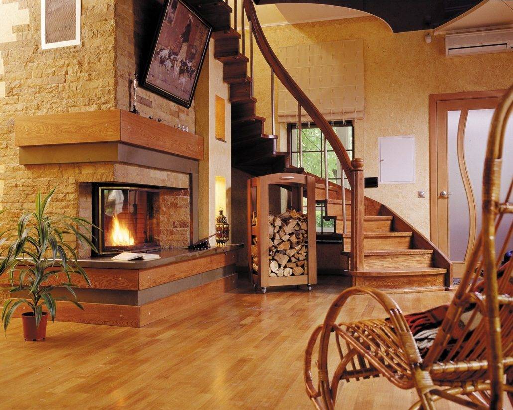 Если дом роскошный, можно использовать элементы классики – дорогая деревянная мебель строгих форм из массива дерева, натуральный камень на полу, декоративные светильники с позолоченной арматурой, лепнина на потолке.