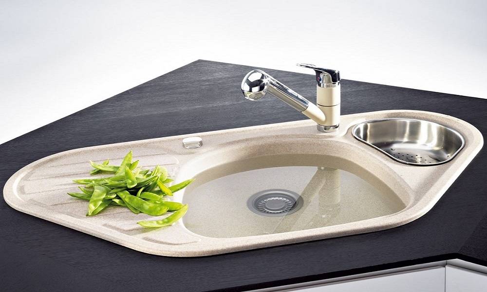 Чаша раковины угловой мойки на кухне из искусственного камня