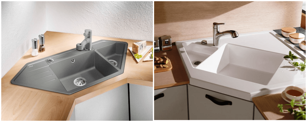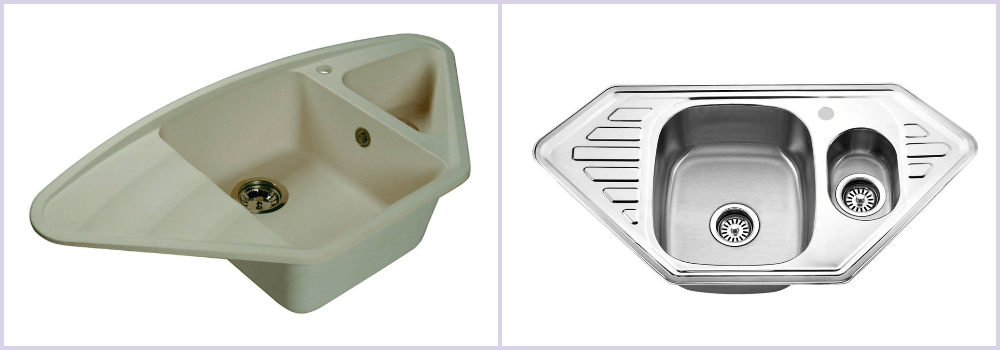 Угловая раковина на кухне может иметь любую форму. Чаще всего используют следующие вариации: