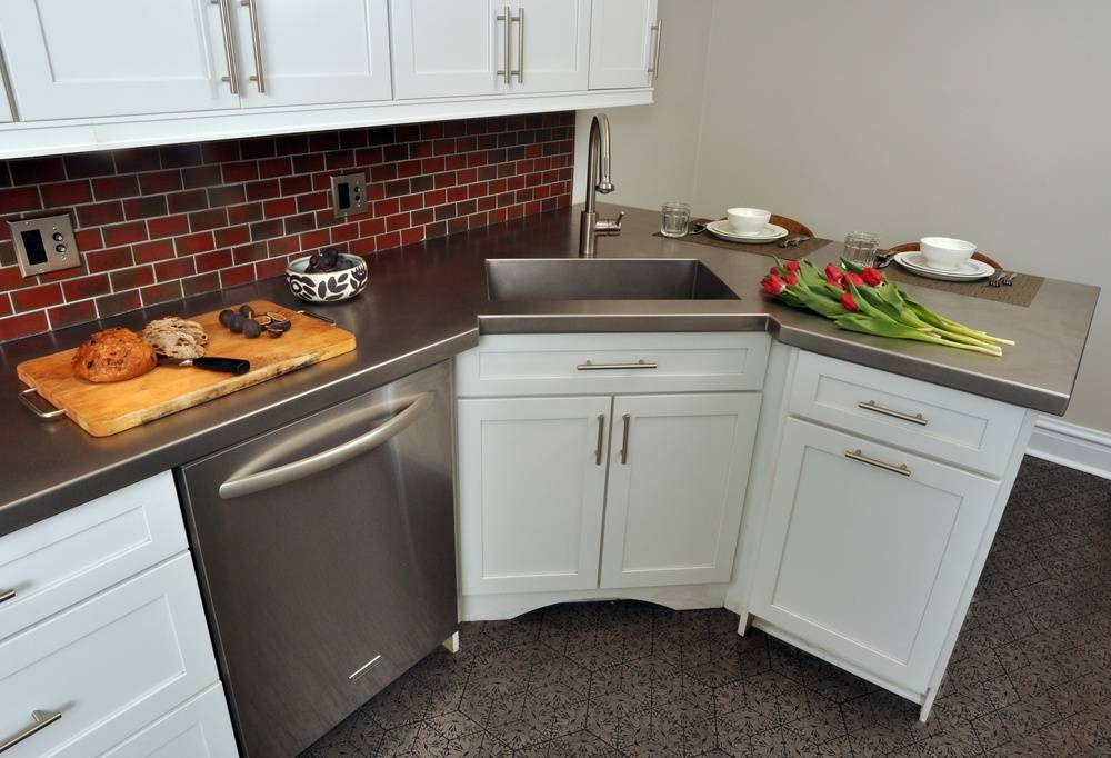 - Если установить слишком крупную раковину, угол, расположенный прямо за ней, может стать так называемой «мертвой зоной». Впрочем, такое место отлично подойдет для размещения разных кухонных мелочей, которые всегда должны находиться под рукой.