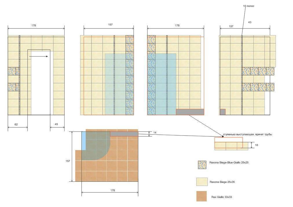 На схеме обозначается метод расположения керамики. Следует выбирать цвет и раскладку, которая будет сочетаться с предметами интерьера, вписываться в общий дизайн помещения. После чего рассчитывается площадь стен и пола. Для этого потребуется замерить длину всех стен в комнате, посчитать высоту. Высчитать общую площадь ванной, из нее вычесть значение дверного и оконного проема, если таковой имеется.