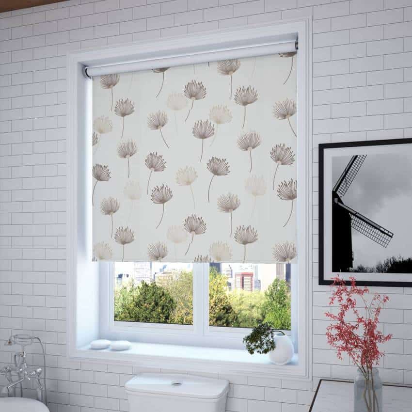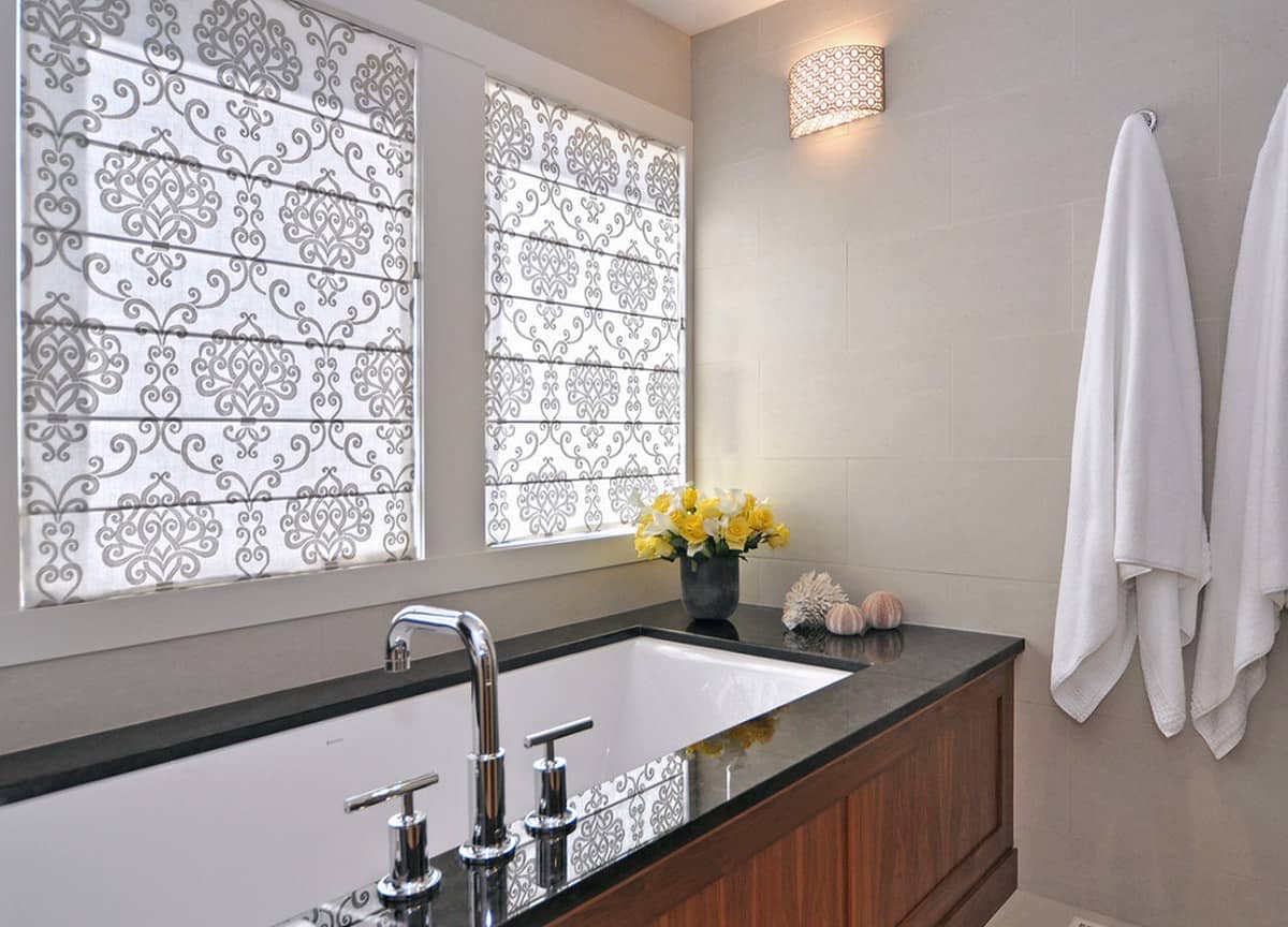 Для ванной комнаты применяют рулонные шторы из влагостойкого материала. Полотно покрывают специальными пропитками, которые повышают устойчивость изделия к воздействию влаги и развитию грибка.