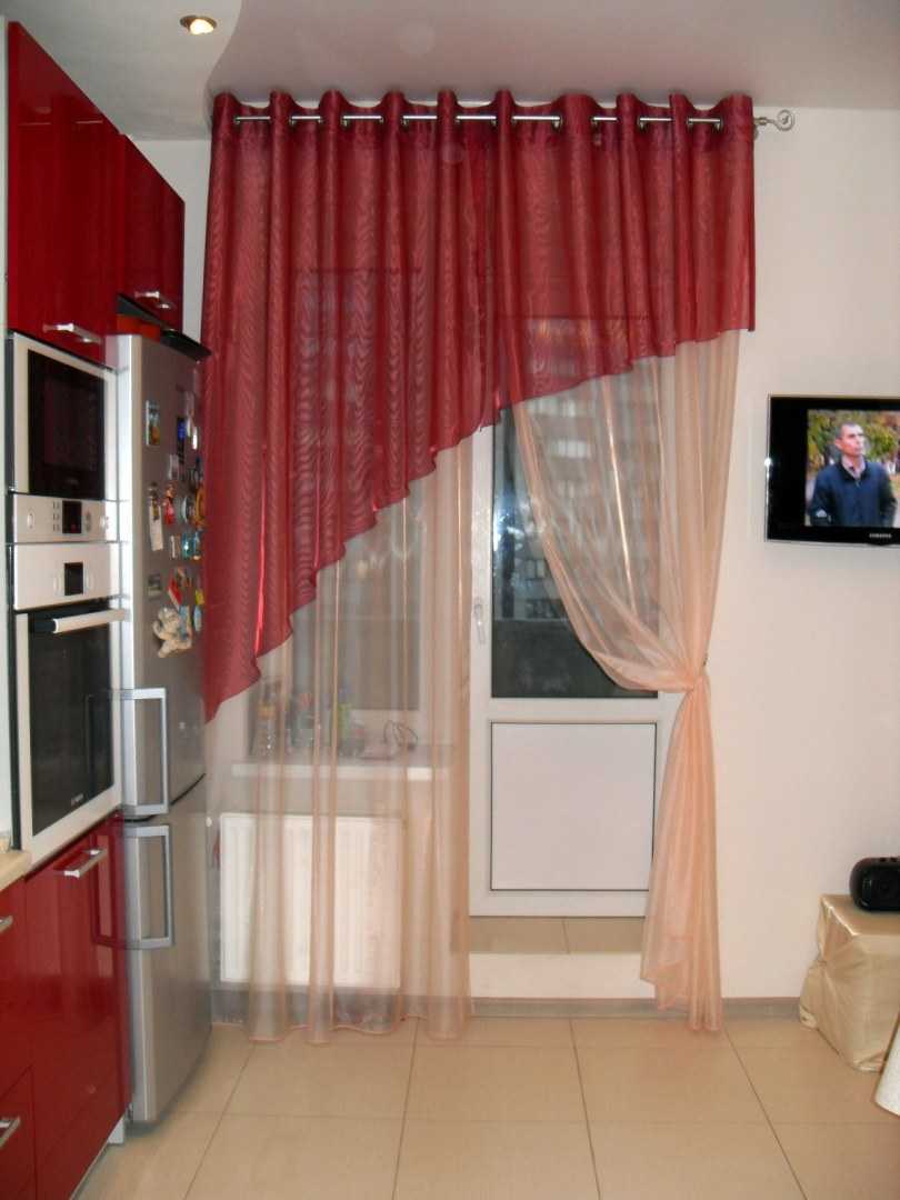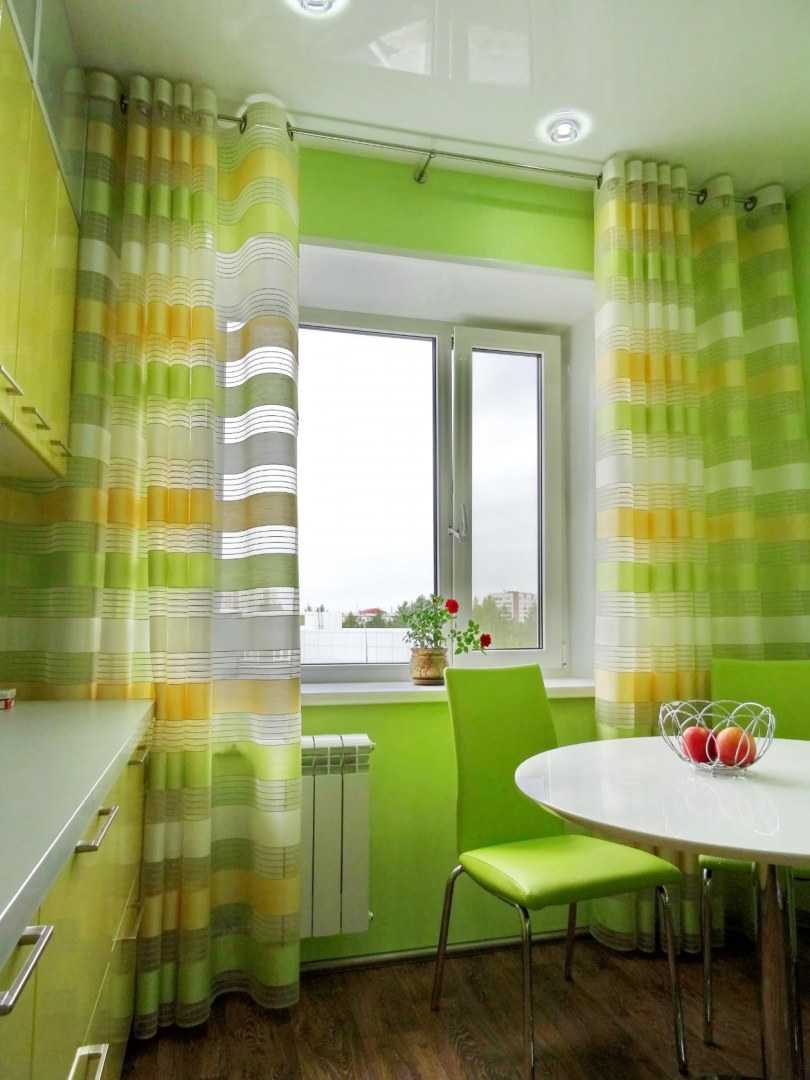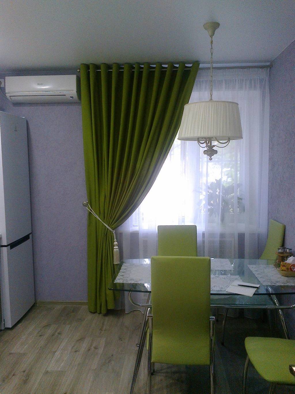 Если кухня высокая и достаточно просторная — длинные шторы в пол удачное решение