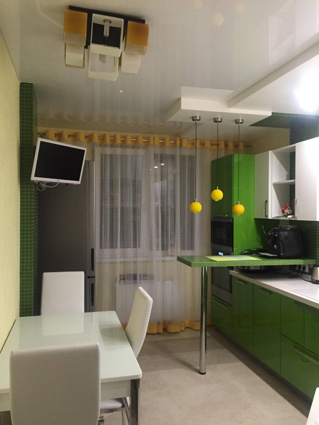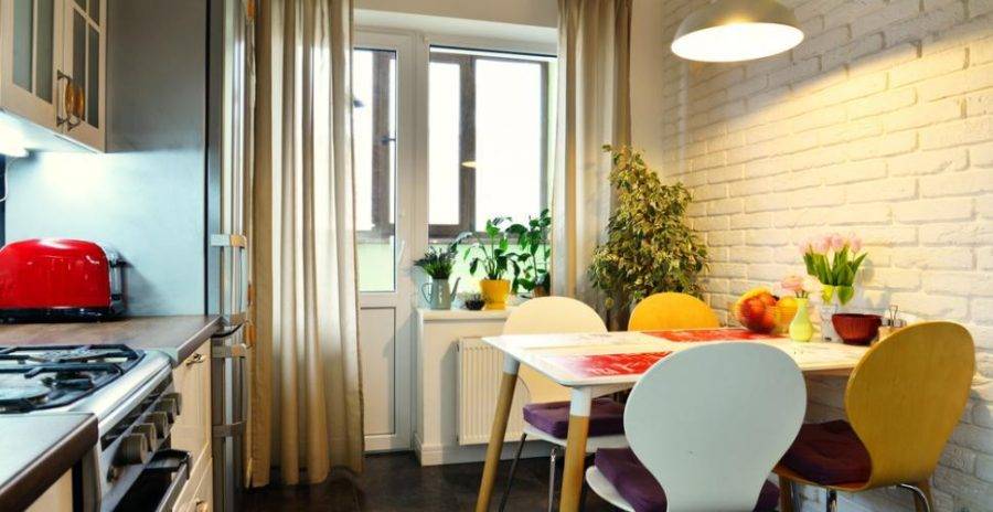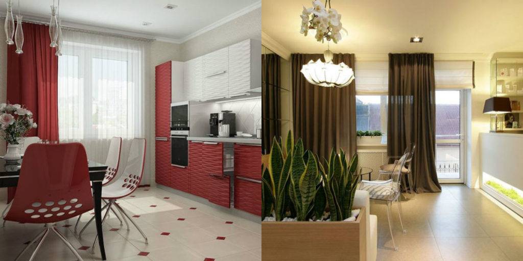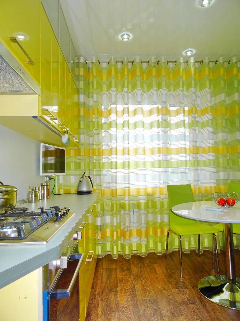 Если кухня высокая и достаточно просторная — длинные шторы в пол удачное решение