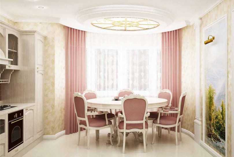 - Просторная кухня в классическом стиле, оформленная в бело-мраморных тонах. Шторы по бокам панорамного окна и обивка на мебели выдержаны в приглушенных розовых тонах, занавески из белого тюля.