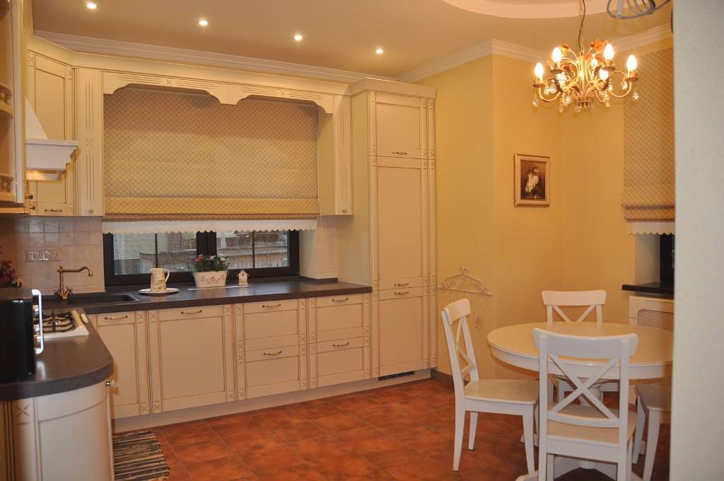 Для оформления окна классической кухни подойдут гардины, легкий тюль в сочетании с портьерами или ламбрекеном, римские с соответствующим рисунком или в характерном цвете.