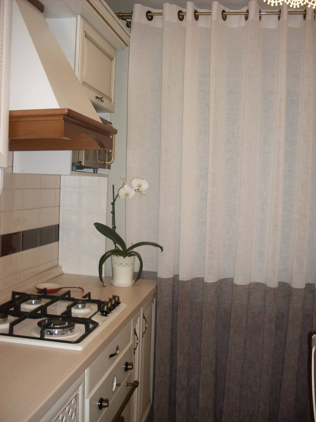 Для компактных кухонь шторы на люверсах тоже выбирают, хоть и нечасто. Под такими шторами подразумевают удлиненные занавеси, в часть полотна которых вшиты спец кольца, которые выступают в качестве крепежной системы карниза.