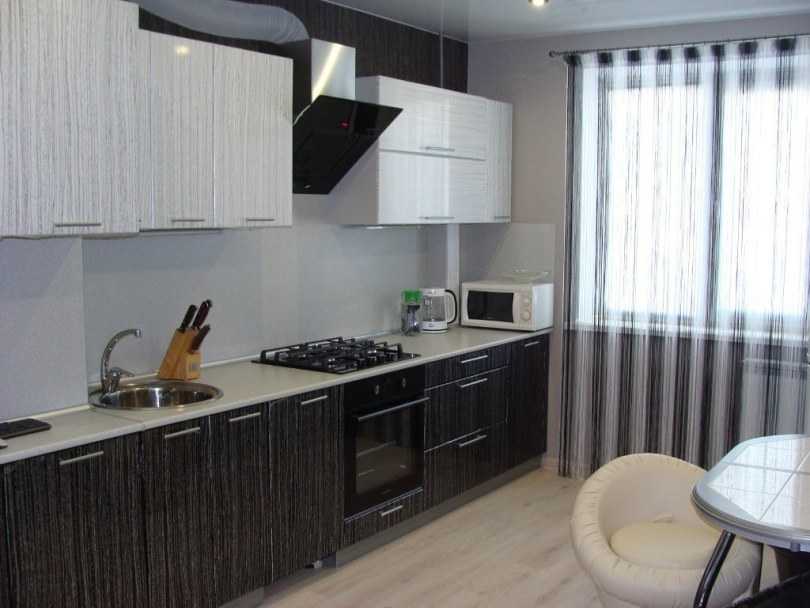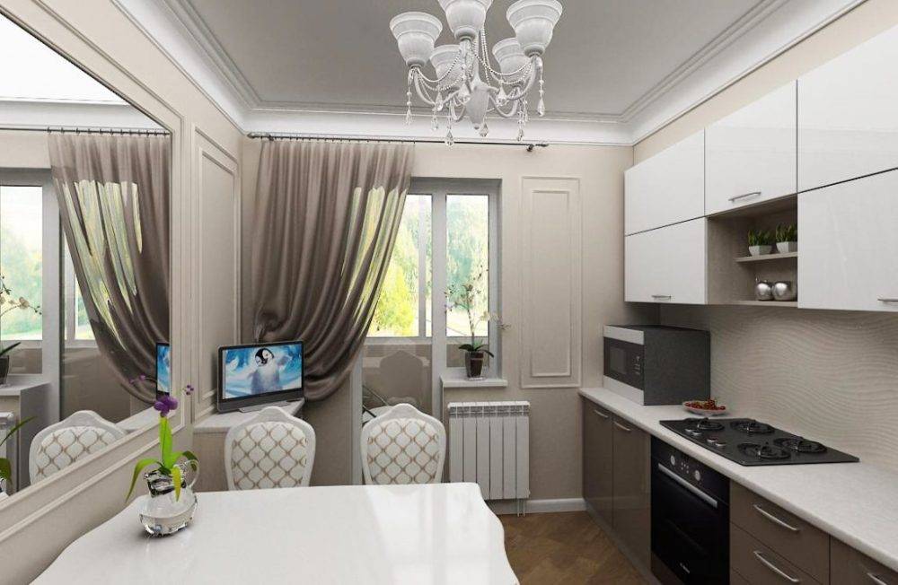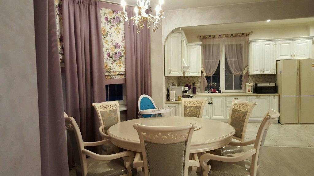 Для классической кухни-гостиной или кухни, совмещенной со столовой, можно выбрать длинные гардины.