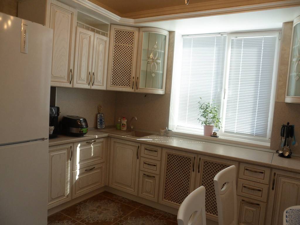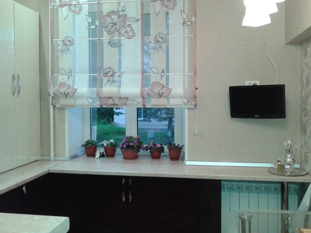 - Очень короткая занавеска на одну треть панорамного окна, с восточным узором, скрывающая карниз. Открывает декоративные растения, стоящие на подоконнике. Рабочая зона и мойка находятся возле окна.