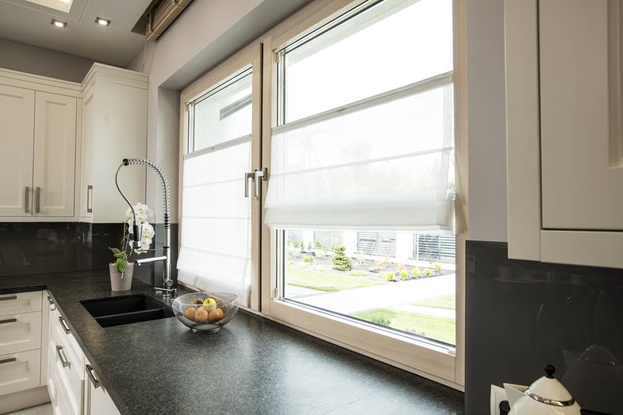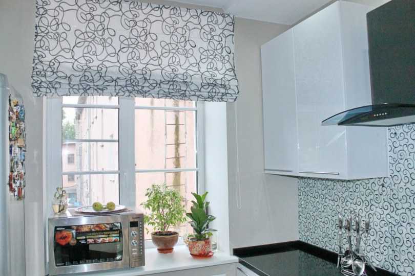 Если шторы будут находиться в непосредственной близости от рабочей зоны и плиты, то ткань должна обладать грязеотталкивающими свойствами и малой гигроскопичностью. Именно из такого материала шьют большинство рулонных и римских штор – а именно, из полиэстера.