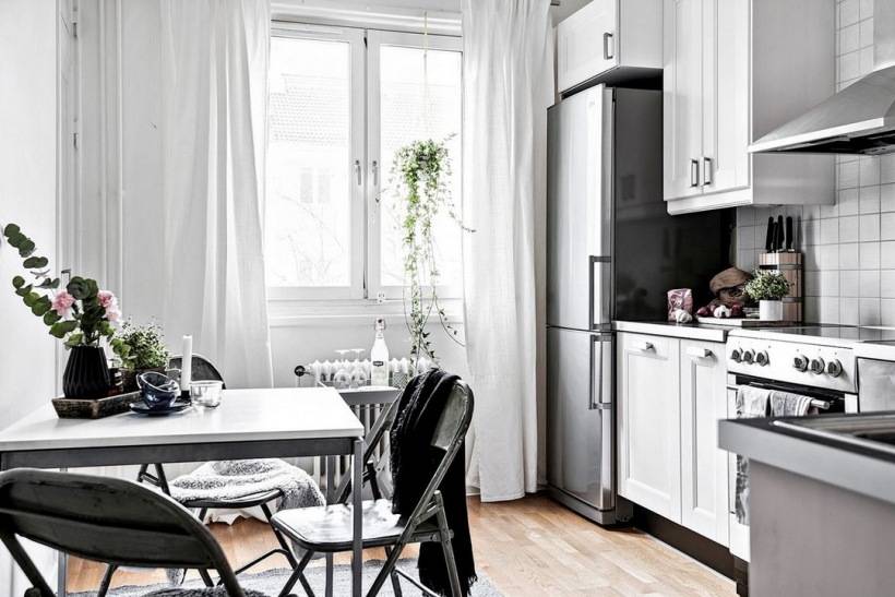 На маленькой кухне стоит отдать предпочтение современной классике или, так называемой, неоклассике. В этом случае лучше отказаться от многослойности, пышных и богато украшенных вариантов, а выбрать что-то более простое и сдержанное. Например, можно оставить всего один ламбрекен, если нет необходимости скрываться от яркого солнечного света, или повесить легкие гардины из тюля или органзы. Универсальным вариантом будут римские шторы однотонного дизайна или с неброским узором.