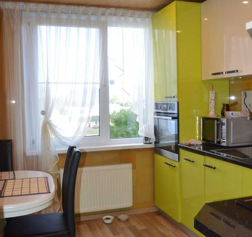 Классический способ украсить окно – это тюль, светлый тон подойдет в любую ярких расцветок кухню.