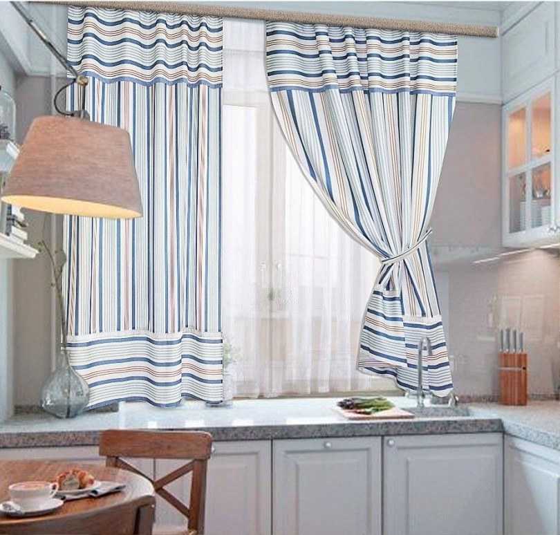 Для маленькой кухни с невысокими потолками подойдут шторы с рисунком в виде вертикальных полос – они зрительно увеличивают высоту стен, а если кухня с обычными или высокими потолками – можно и поэкспериментировать с горизонтальными полосами, они увеличивают ширину стен но и немного скрадывают высоту.