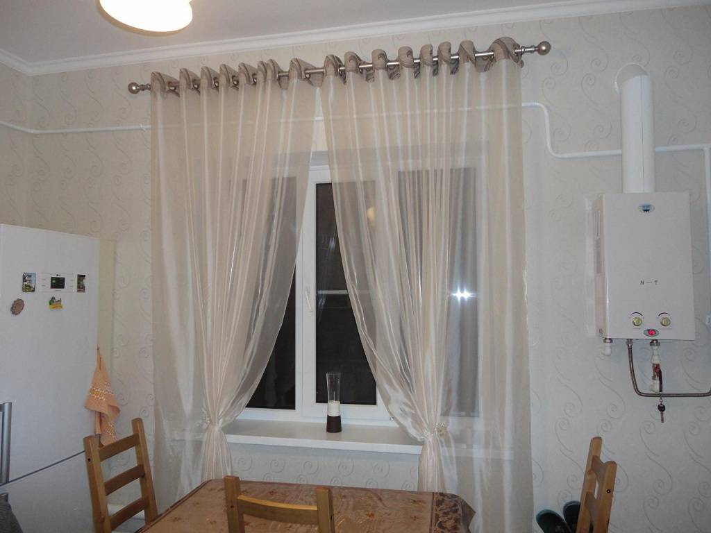 Уточнение! Если круглый карниз крепится прямо под потолком, длинные тканевые полосы визуально «приподнимут» потолок. Выбирая шторы на люверсах для малогабаритной кухни, стоит смотреть на светлые ткани, которые смогут визуально расширить, а также увеличить имеющееся пространство.