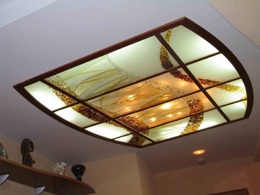 Если применить оба условия, монтаж витражных потолков не доставит сложностей. Элементы будут укладываться без зазоров, нестыковок. Вот чтобы декор прослужил как можно дольше, то отделка из гипсокартона предварительно шпаклюется, грунтуется, а базовое основание перед обшивкой ГКЛ пропитывается антисептиками.
