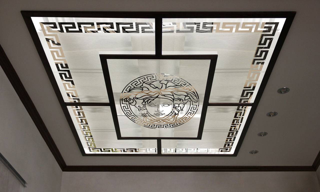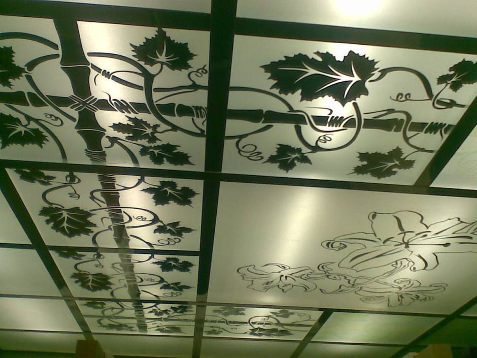 Так называют светопрозрачное стеклянное панно с нанесенным на него разными методами рисунками, обрамленное рамой (системой профилей). Декор крепится к базовому потолку, стенам или каркасу, и чаще всего выступает частью подвесной конструкции.