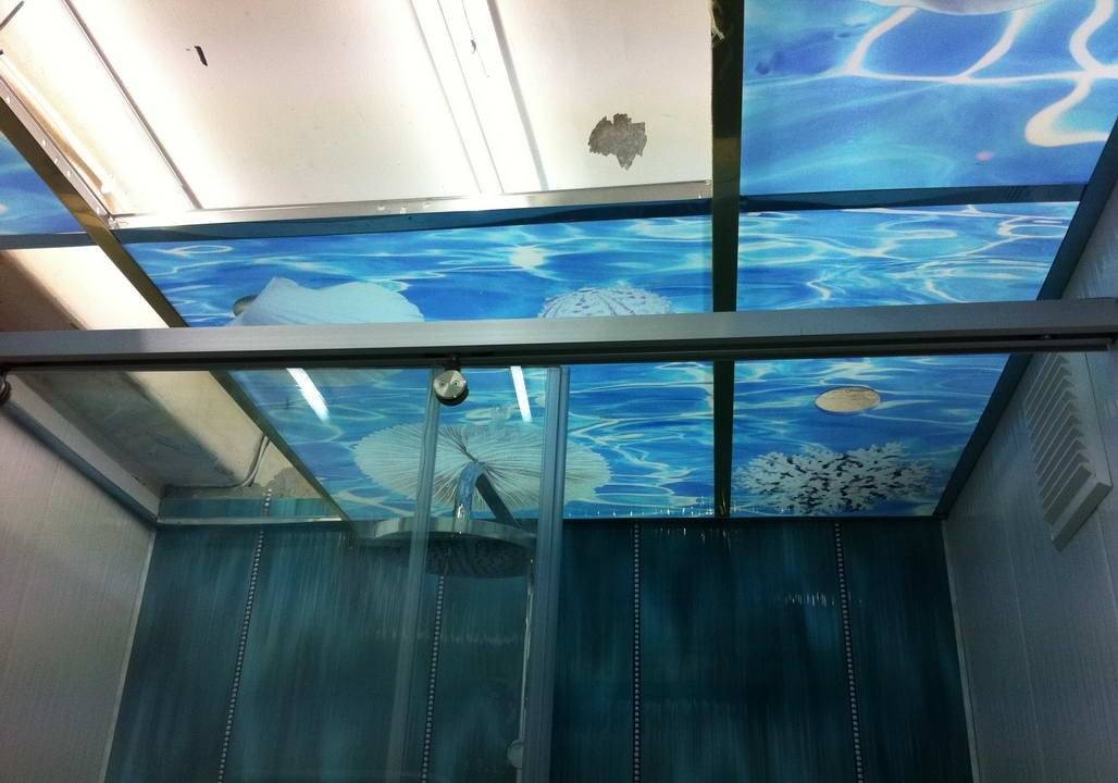 Один из самых доступных способов получить декор — использовать натяжные полотна из поливинилхлорида. Пленки берут транслюцентные, или пропускающие свет. Методом фотопечати на них наносится соответствующий рисунок. Декор выглядит довольно правдоподобно, особенно если сверху применяется светодиодная подсветка.