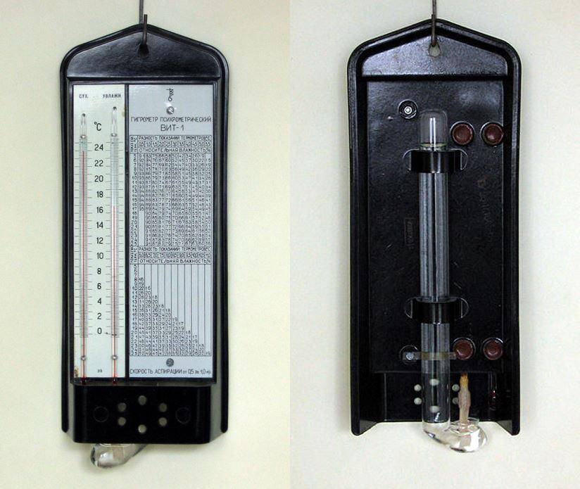 Самый простой прибор, которым измеряется влажность внутри помещений, психрометрический гигрометр, он же психрометр.