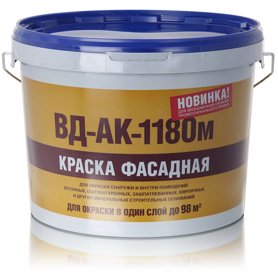 Краска ВД-АК-1180 фасадная — применяется для окрашивания внешних поверхностей, а также поверхностей внутренних во влажных помещениях. Устойчива к температурным колебаниям, а также воздействию света и влаги. Не допустимо использование при низкой температуре и в дождливую погоду.