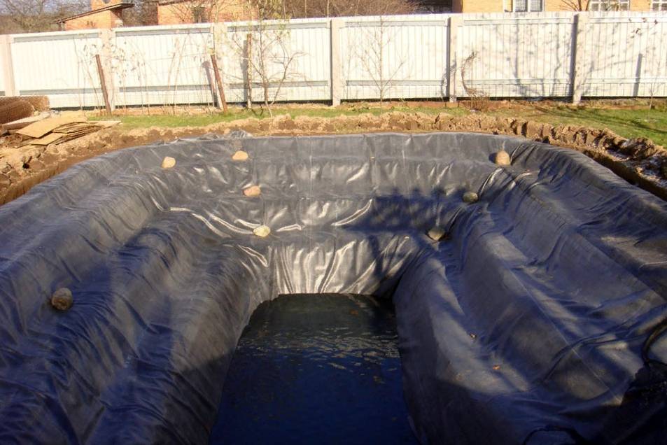 Во втором случае на дно ямы-котлована насыпается песок (влажный) примерно на 3 см. На песок застилается пленка, края которой необходимо прижать большими валунами. Когда бассейн заполнится водой, пленка примет необходимую форму. Края у пленки отрезаются не полностью — нужно оставить примерно 20 см, и далее прикрепляем ее к земле шпильками или гвоздиками. Укладываем камни, а на дно засыпается грунт для растений. Если у вас будет маленький объем, то получится необычный мини декоративный водопад.