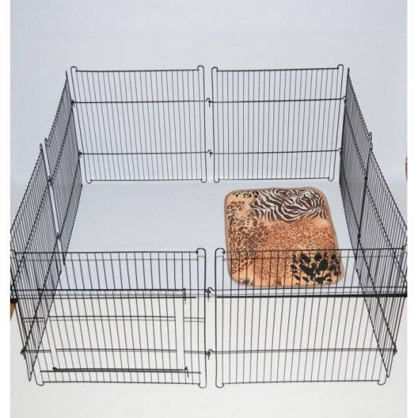 Домашние вольеры из металлических секций очень популярны из-за простоты в сборке и чистке. Они прочны и легко вписываются в интерьер. Такая конструкция удобна тем, что её можно собрать в виде забора (например, чтобы перегородить выход из комнаты).