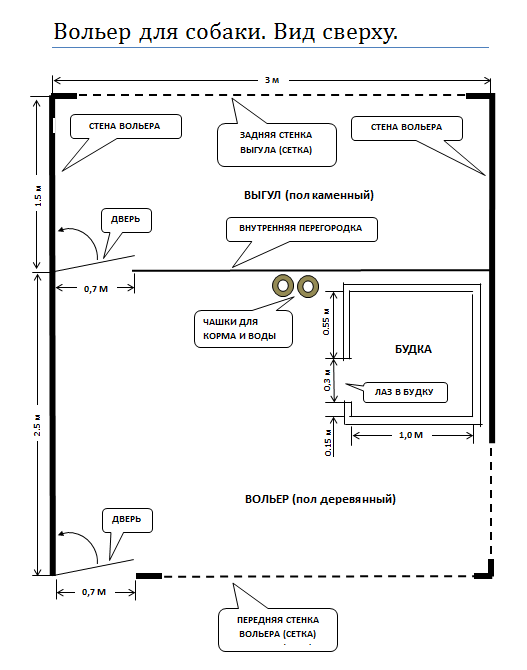Вольеры, указанные в первых двух вариантах, оборудуются будкой. Третий вариант используется для короткошёрстных пород собак, и в нём будка необязательна.