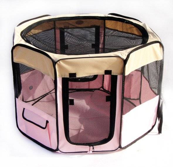 Для небольших собак существует вольер-тент. Он удобен, когда необходимо оставить питомца дома одного, не боясь, что он причинит себе вред или испортит что-нибудь в квартире. Когда приходят гости, в такой вольер помещают небольших собак, чтобы они не путались под ногами, и на них никто не наступил.