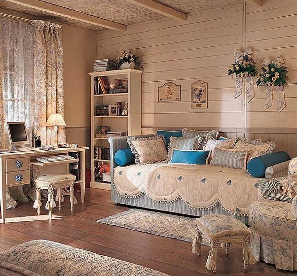 Текстиль. С его помощью украшаются: окна, дверные проемы, столы, кровати, кресла. На окна вешают легкие занавески, диваны застилаются вышитыми покрывалами, сверху которых располагаются многочисленные подушки. На креслах также присутствуют пледы или текстильные чехлы. Над кроватью вешаются полупрозрачные балдахины, вносящие в спальню романтичность и элегантность.