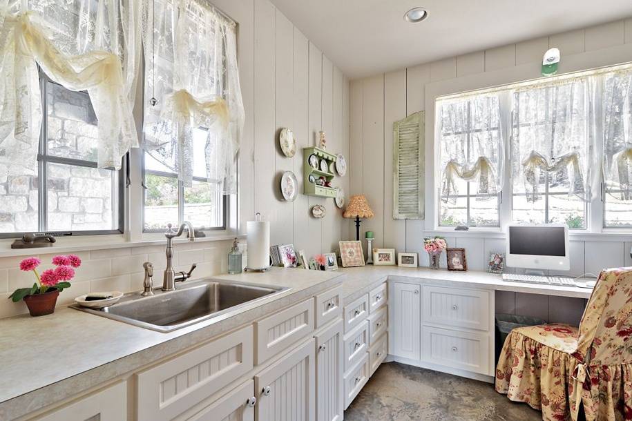 При использовании деревянных панелей, окрашивайте их в светлые тона или же побелите. Кроме стиля, такие цвета визуально расширяют границы комнаты. Применяйте технику старения для мебели и поверхностей. Используйте декоративные элементы: картины с лавандовыми полями, петухами и подсолнухами, фотографии, светильники в виде свечей.