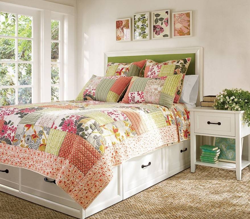 Покрывала для кроватей могут быть выполнены как в стиле пэчворк, так и простые, с цветочным рисунком.