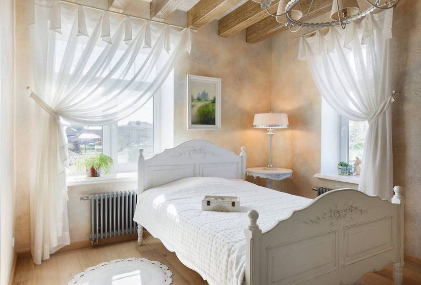 Для прованской спальни используются шторы с воланами, оборками и рюшами. Их цветовая палитра должна сочетаться со стенами, обивкой мебели и другим текстилем.